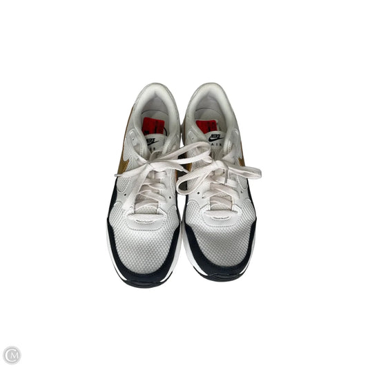 Woman walking outdoors in a park-like setting with trees and people in the background